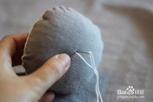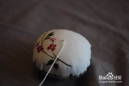 从针插的底布正中间用针戳过去(可以使劲把线往上拉,这样打的结就进入棉花里了,外面看不到),然后又从针插正面距离之前针眼2mm的位置将针戳到底布,使劲拉线,这时候针插中间出现一个凹形,立体感出来便可,然后把针从底布再戳回表布