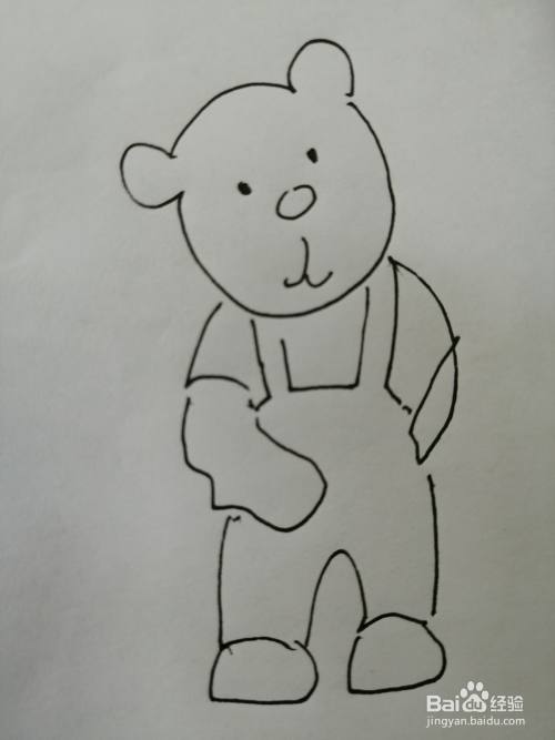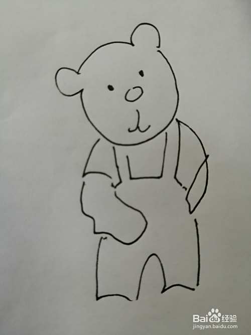 第五步,然后继续画出可爱的小熊的身体和两只手臂,注意小熊衣服肩带的画法。