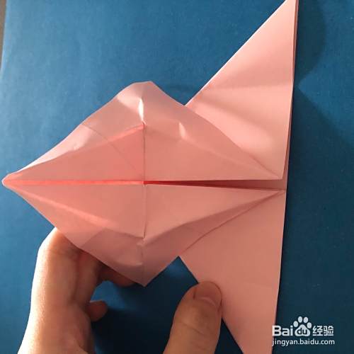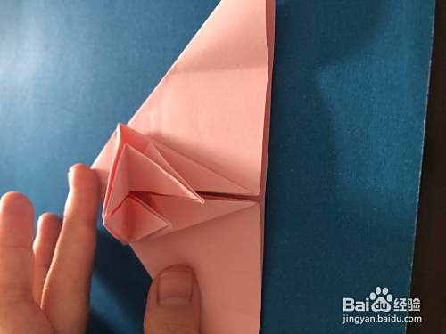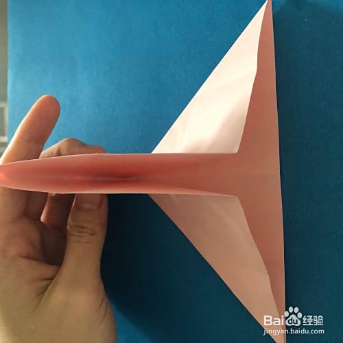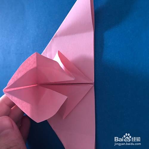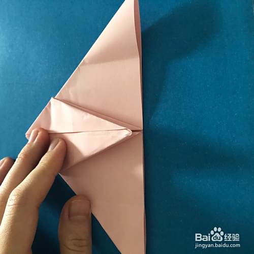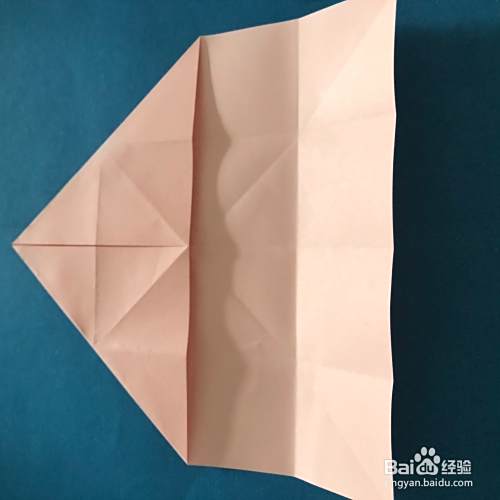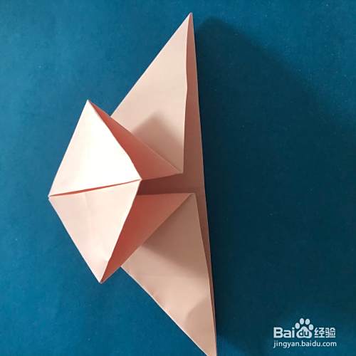 把刚刚这点好的两边,我们从里面拿到外面,他的这种打开就会变成如图所示的模样。接着我们将纸张往里进行折叠变成第四张。