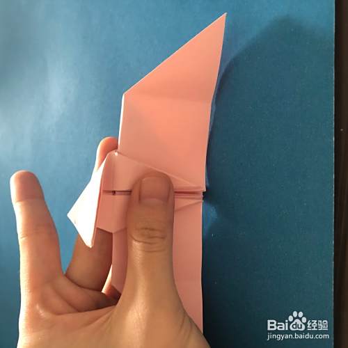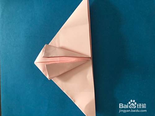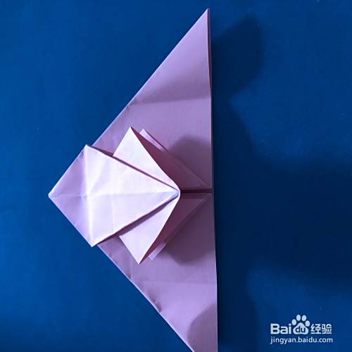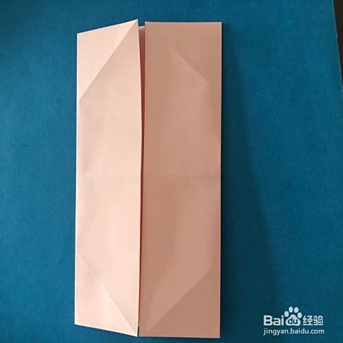 将左边的两个角网中心线方向进行折叠,接着,我们把纸张反过来类似这双三角形的模样,将它折好。