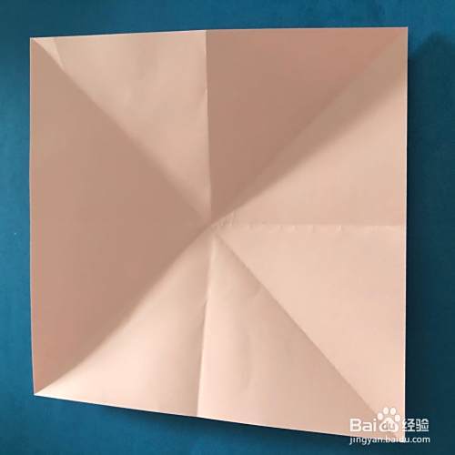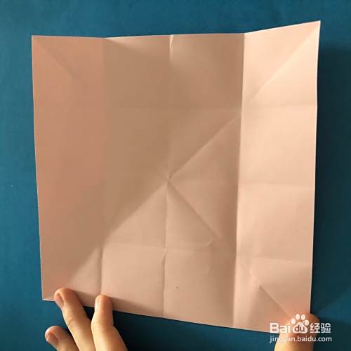 准备好一张正方形的纸张,我们将纸张进行上下对折,对角线,对折中间会出现一个十,接着,我们将左边和右边的区庄往中心线折叠在进行打开。