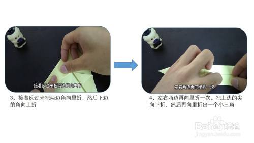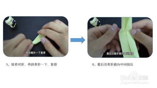 首先拿一张正方形的纸斜着对折,打开再斜着对折,然后两条边对齐中间斜着的折痕折过去,再把两个角向左右折起。