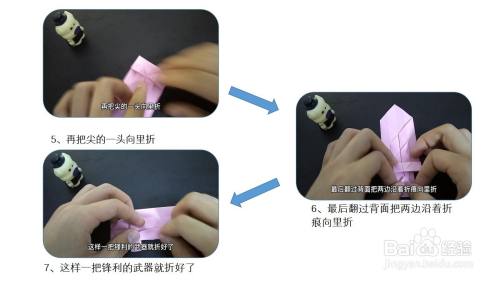 接着对折,再斜着折一下,复原,最后沿着折痕向中间按压。这样一把可伸缩的武器就折好了。