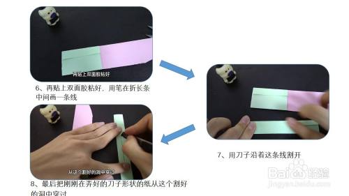 再贴上双面胶粘好,用笔在折长条中间画一条线,用刀子沿着这条线割开,最后把刚刚在弄好的刀子形状的纸从这个割好的洞中穿过。这样一个尖锐的武器就折好了。