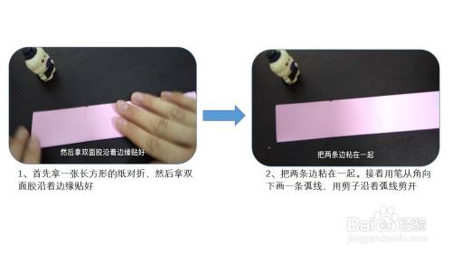 然后再拿一张长方形的纸,沿着刚才那张底部卷起来,再贴上双面胶粘好。然后再拿出一张长方形的纸折成一个长条。
