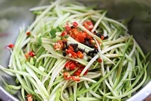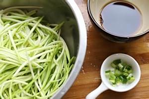 将西葫芦丝装入一个大点的容器内,加入小葱,料汁,盐,小米辣。