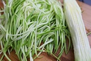 用刨丝的工具将西葫芦刨成细丝,刨丝的时候注意,不要刨到内瓤,内瓤的口感不好,可以留着炒菜的时候用。