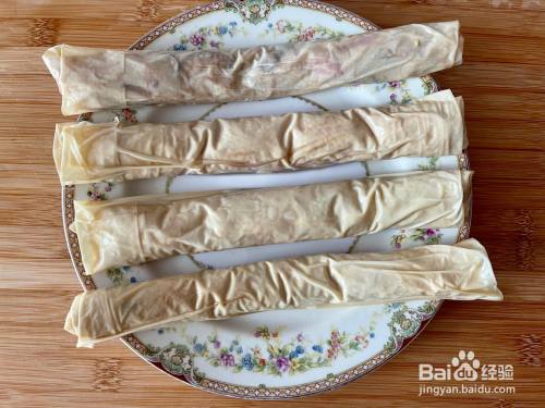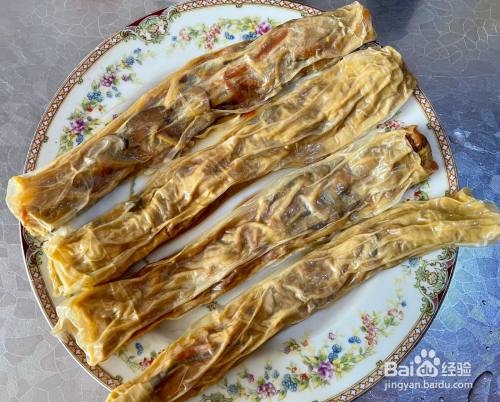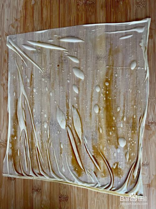 把豆皮摊平,用小刷子蘸取料汁,轻轻地刷在豆皮表面 ⚠️注意⚠️一定要轻轻的,豆皮太嫩了易破。把炒好晾凉的三丝取适量如图所示,均匀放置在豆皮的一端。从有三丝的那头往另一头卷豆皮,卷的时候要把左右两端往中间折,就像包春卷一样。