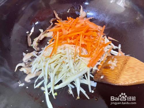 干香菇提前用温水泡发,泡发后切丝。注意泡发香菇的水先留着,一会儿有用处。胡萝卜,去皮后切丝。冬笋,去笋衣去根后,对半切开,焯水以去除草酸。焯水后,切丝。葱切花,姜切末。起油锅,爆香葱花姜末。