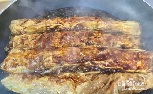 素鸭卷卷好了,放置在一个平盘上 。卷和卷之间必须保持一定距离,不然的话等蒸熟后会粘在一起的。水开后上锅蒸,大火蒸8分钟。平底锅,一丢丢油,把素鸭卷放进去煎一煎。煎到两面焦黄的色面即可。倒入料汁,煮2~3分钟,料汁浓稠即可出锅。