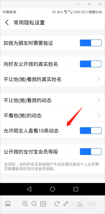 将“允许陌生人查看10条动态”激敏施功能关闭,即可禁止陌生人查看支付宝动态。