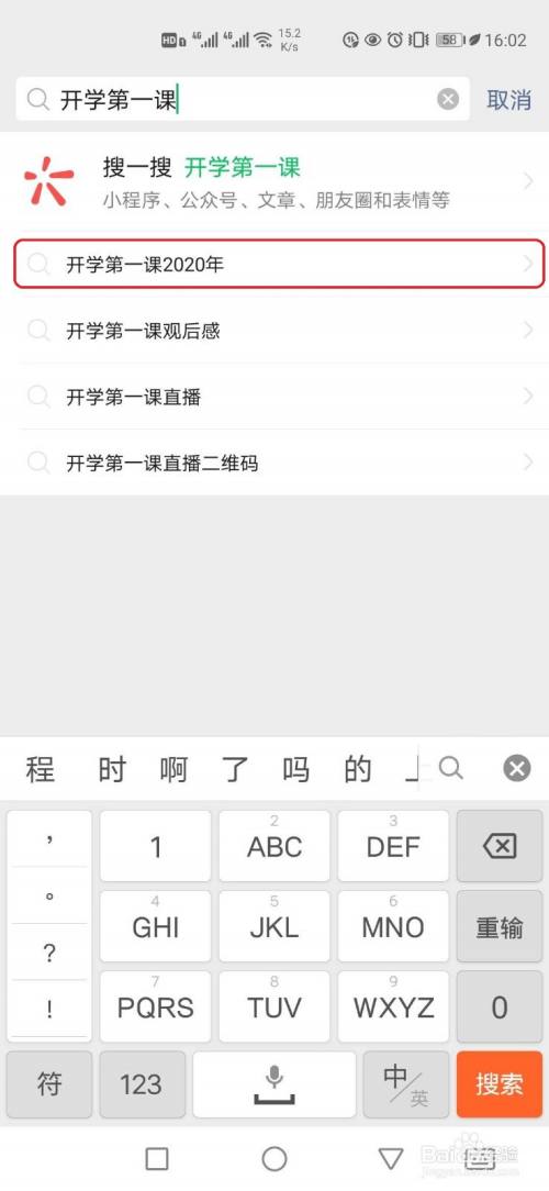 打开【手机微信客户端】,选择上方的搜索框,输入【2020开学第一课】。