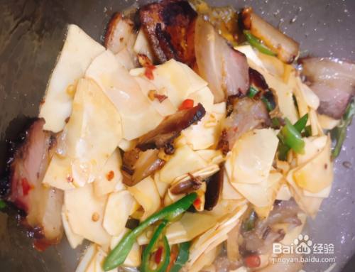 第二步,2分钟的时间,将焯好水的冬笋从锅中捞出,过一遍凉水,控水,腊肉一小块,先放入锅中煮一煮,捞出,将腊肉切成薄一点的片;
