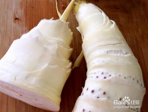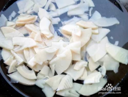 第一步,冬笋事先处理干净,剥皮,将冬笋切成稍微薄一点的片,在锅中添上水,将水烧开,放入一勺食盐,将切好的冬笋放入锅中焯水;