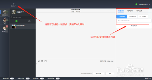在右侧还可以选择快捷语进行回复,省时高效。如果想要进行群发操作的话可以直接点击左上角的“群发助手”,一键推送,可以突破200人的限制,省时高效。