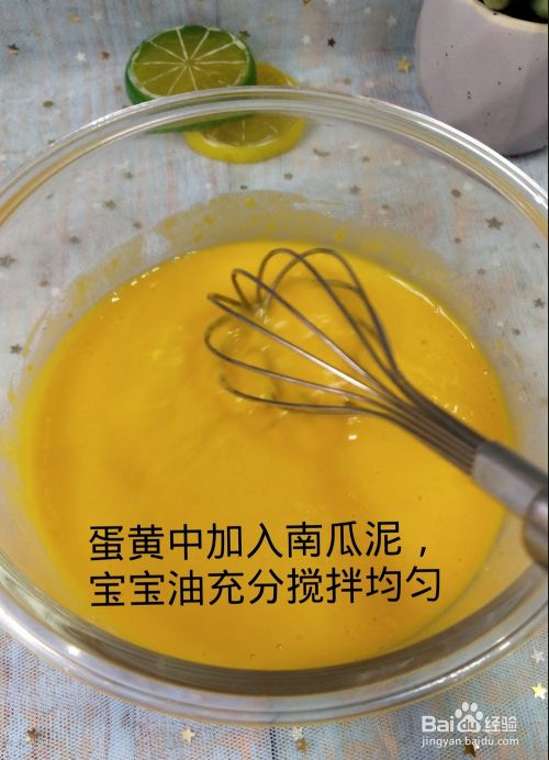 在蛋黄中加入南瓜泥,婴儿油炒匀。搅拌至完全熔化。