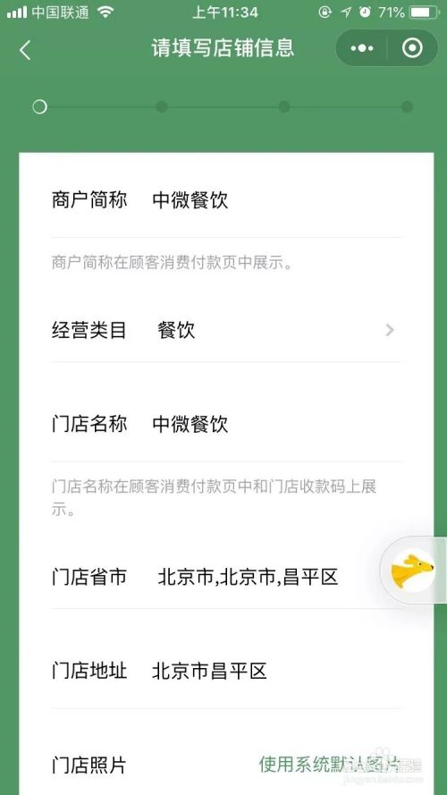 进入申请页1,填写资料提交附件。有商户简称、经营类目、门店名称、门店省市、门店地址、门店照片,其中门店照片需要提交两张,一张为门头,一张为前台。提交完成后点击下一页;