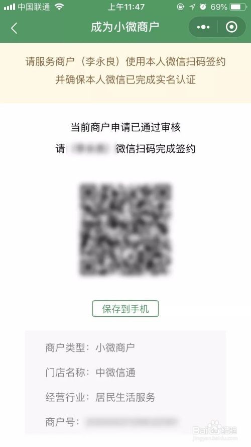 接下来就会进入成为小微商户页面,会出现一个二维码,将此二维码保存到手机然后使用微信“扫一扫”扫描本地相册,选择刚才保存的二维码正式完成签约;