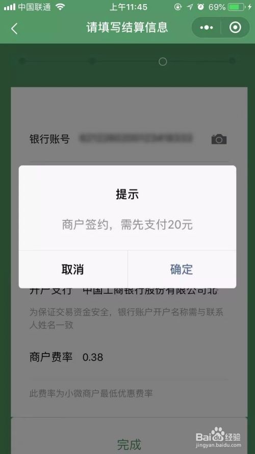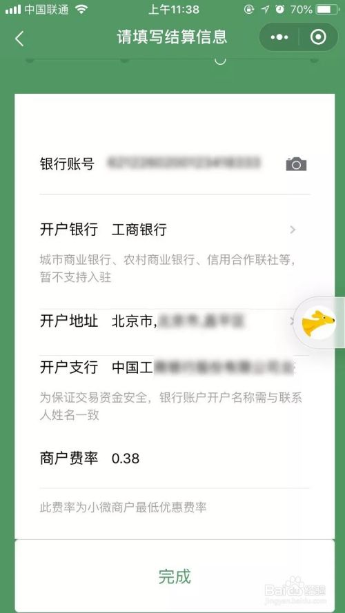 进入申请页3,输入或者上传银行卡图片,填写完整开户行信息以及费率0.38%,费率有几个档次,我们选择最小的。之后点击完成;