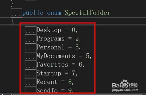 在SpecialFolder枚举属性中,具有多个参数值,例如Desktop、Programs等等。
