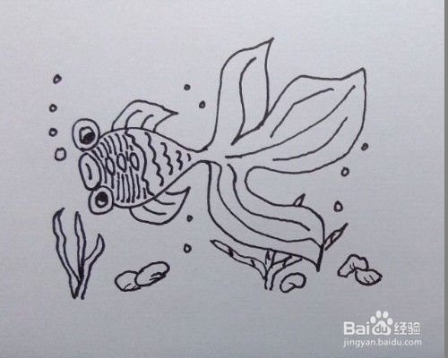 添加水泡、水草和水底的小石块更加显得金鱼的鲜活可爱。