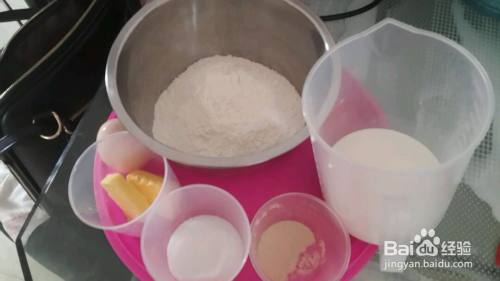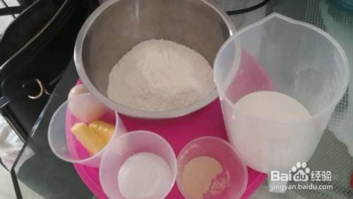 面包机内先放盐,糖,牛奶,和蛋白(只要蛋白蛋黄要留来搽面包表面)然后再放面粉再先放酵母(酵母一定要放最后不能与盐和糖接触否则酵母的活性会减低)