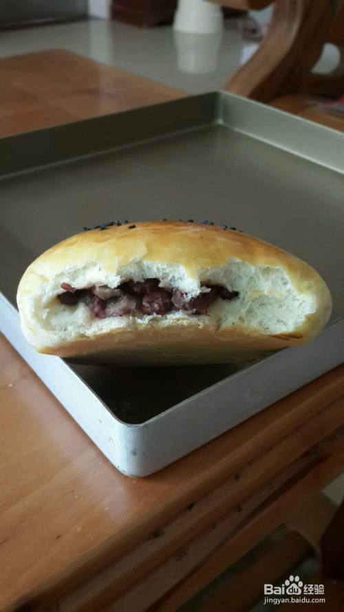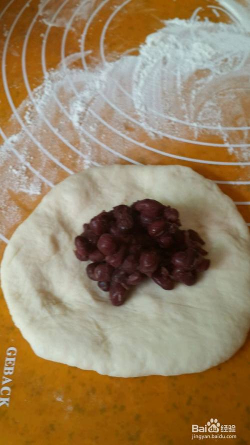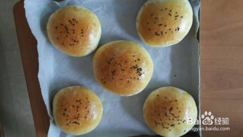 擀好的面皮包上煮好的红豆,用包包子的方法封口,封好口的那一面朝低放在铺好的油纸的烤盘中。