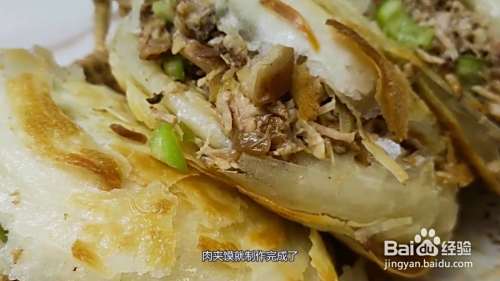 把饼下锅煎至两面微焦,再烤10分钟,把饼从中间分开,加入肉和青椒,肉夹馍就制作完成了。