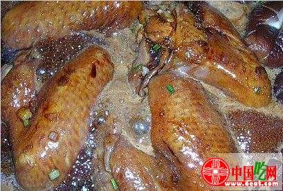 33、加入啤酒烧沸后放入香菇和剩下的两大匙老抽,加盖烧约十分钟后将鸡翅翻面,再烧七、八分钟至汤浓翅耙时起锅装盘。