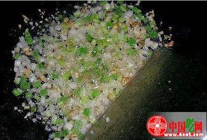 11、锅置火上放油烧至五成热,倒入姜蒜末、葱碎炒至金黄色。