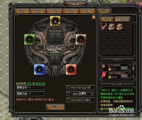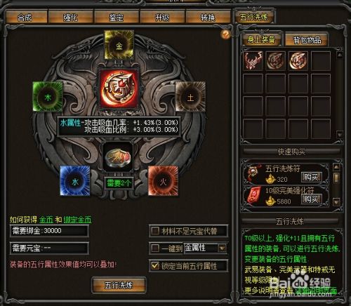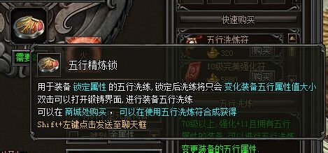 如果你想提高装备的五行属性的值 则需要五行精炼锁 同时会消耗五行洗练符