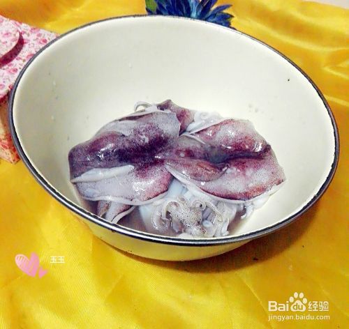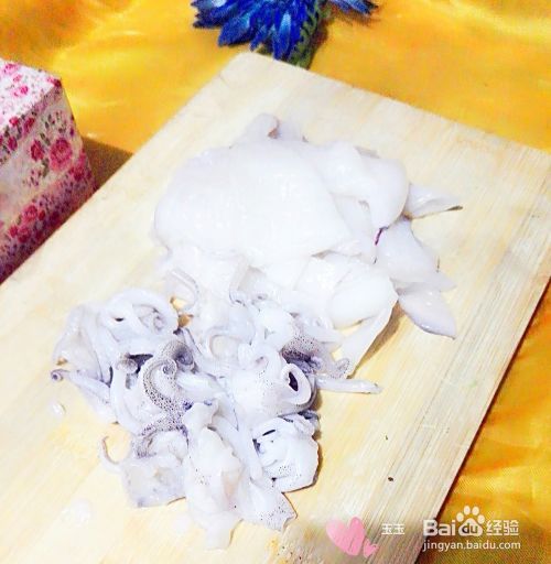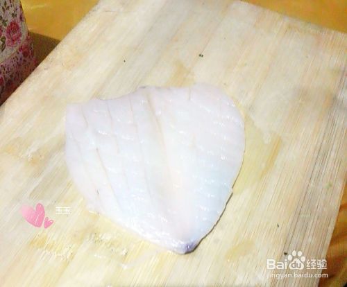 再把鱿鱼一个个打成十字花形花花。就是先横着切口子再竖着切口子,就变成了鱿鱼花花了。