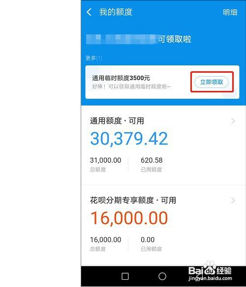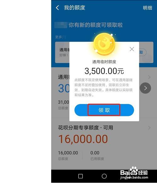 4点击领取,确定,可以获得额度,花呗即可成功提取。