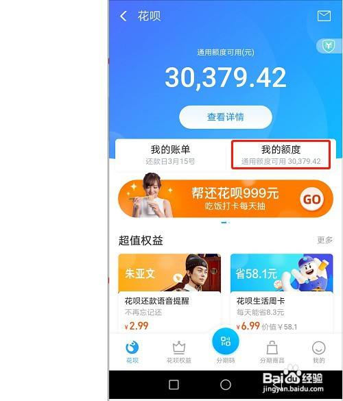 进入借呗后,点击右下角我的,在我的界面找到我的额度,点击查看额度,