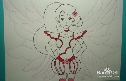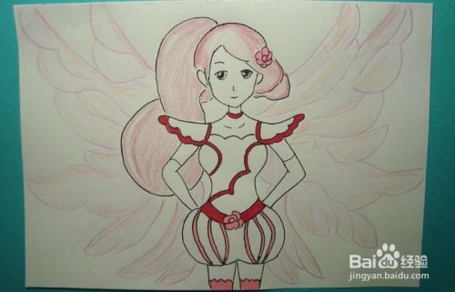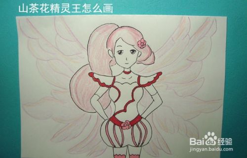 最后,用红色和粉红色彩色笔给山茶花精灵王的头发和翅膀涂上颜色,注意颜色要涂的均匀些,这样美丽的山茶花精灵王就画好了,如下图所示。大家按照步骤也来画画吧。