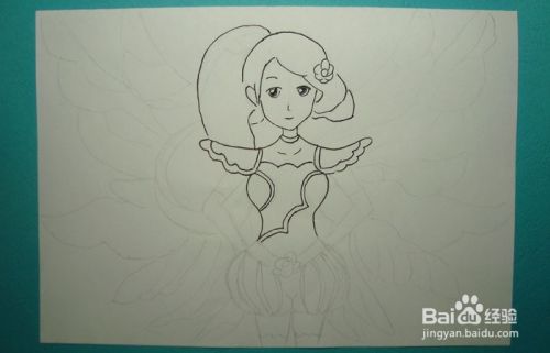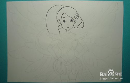 接着,用粉红彩色笔画出山茶花精灵王翅膀的图形,注意翅膀图形要画的对称,这样好看些,如下图所示。