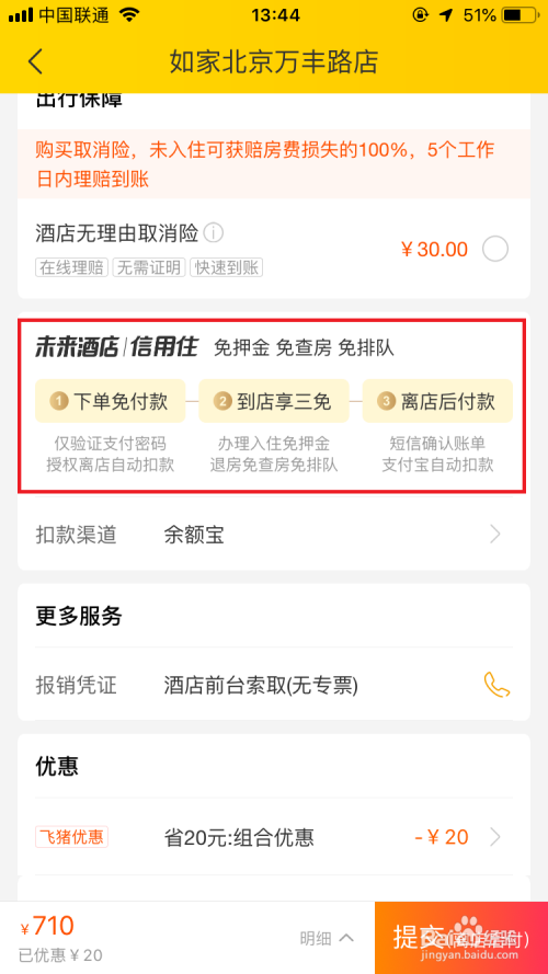 最后,提交订单即可享受信用住,离店后自动扣款。