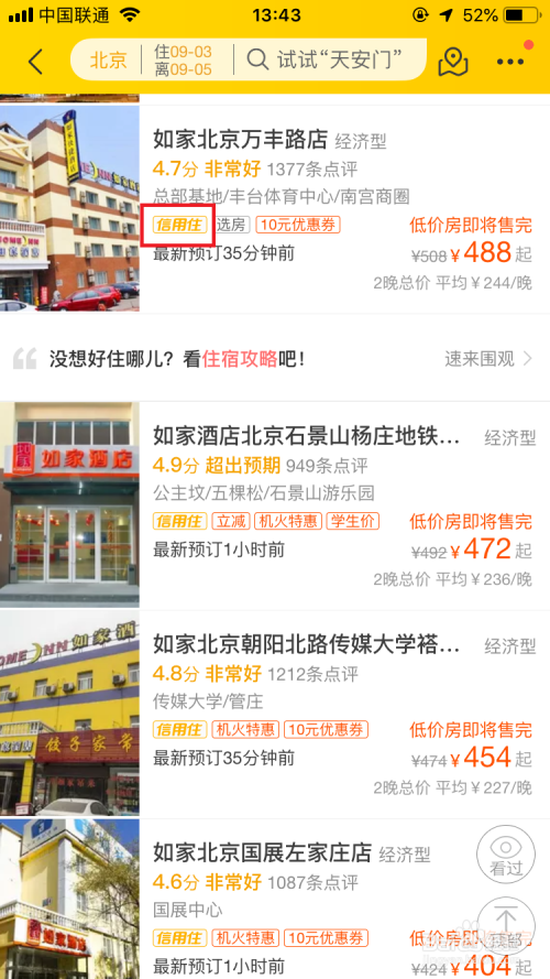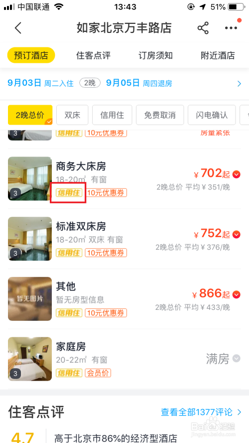 之后,在搜索酒店的界面就会弹出一系列的推荐结果,我们找到标有信用住字样且符合需求的点击进入即可。