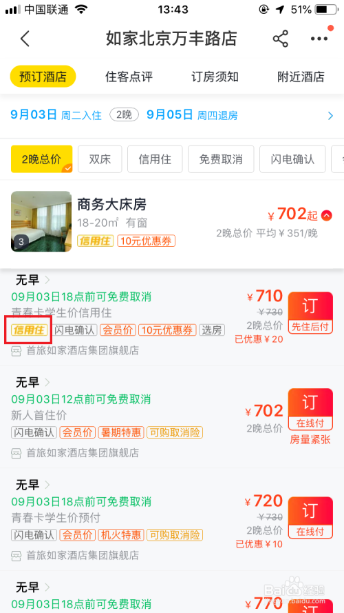 进入酒店界面后,我们还是按照需求找寻合适自己,并且带有信用住字样的房间点击预订。