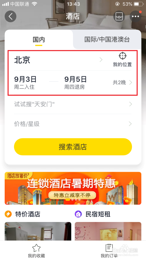 在酒店预订界面输入自己的需求:城市、入住时间、退房时间、特殊位置需求。