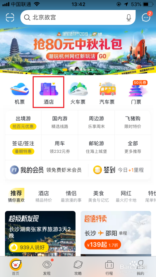 首先,打开飞猪,在首页选择酒店进入酒店预订界面。