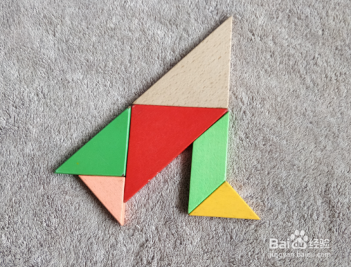 将粉色三角形直角水平居于右上,放在绿色三角形的下面挨着,直角顶点挨着直角顶点。