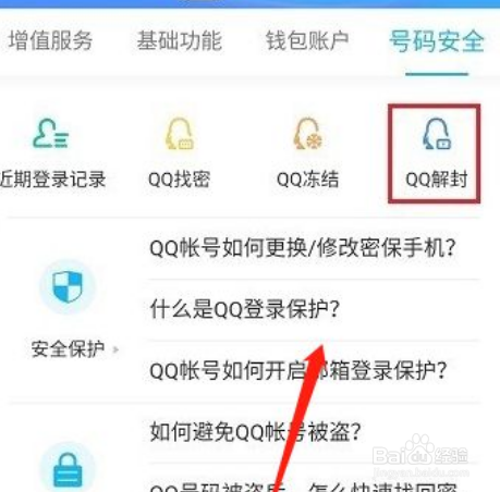 点击进入帮助选项,在手机显示页面上找到点击号码安全,选择点击qq解封。