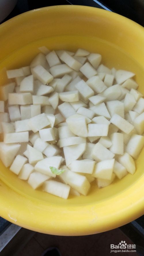 将土豆切块放入水里浸泡,(因为土豆里淀粉含量高,在烧的时候容易粘在锅上)