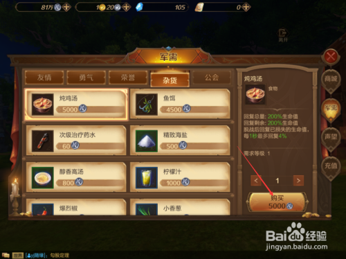 选中后点击右下角的【购买】按键,一碗炖鸡汤需要5000银币,只要玩家准备好银币就可以购买了。