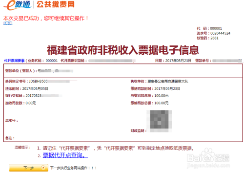 可以看到交通安全综合服务管理平台给出了交易成功的提示,并给出了缴款发票,好了这次扣分罚款处理好了,不要有下次哦!
