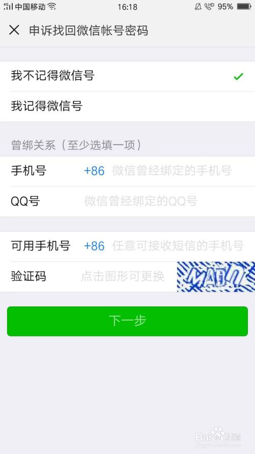 然后,在微信安全中心对话框中选择”找回账号密码”,然后点击”开始申诉”,会出现找回账号密码界面,选择“申诉找回账号密码”,会出现”我不记得微信号”和”我记得微信号”两个选项,按要求填写相应的信息并点击下一步,软件会提示你给腾讯发送短信,发送成功后点击下一步,填写与微信号实名认证一致的绑卡信息,接着腾讯会给你发送验证码。