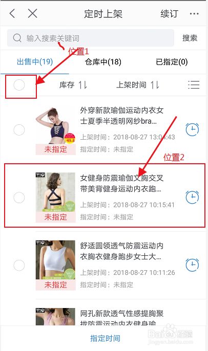 2)点击下图中位置2中的圆框可批量选中商品,然后点击页面最下方的“指定”时间按钮,即可弹出时间设置窗口。
