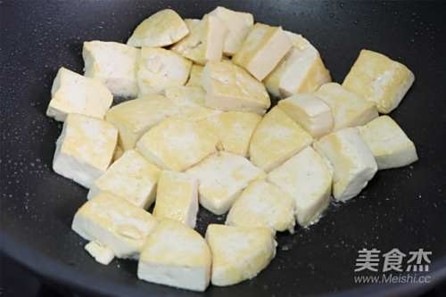 2汤锅里烧开水,把切好的豆腐块放进去,煮2分钟左右;这样用水煮一下,一是可以去豆腥味,二是可以让豆腐在后面的烹饪过程中不容易碎。