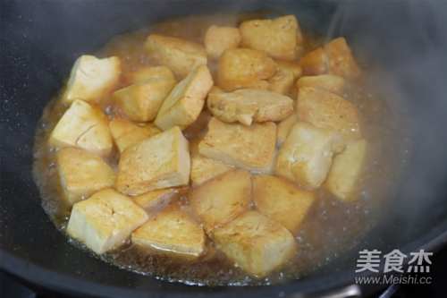 6注入适量的清水,加少量的生抽酱油和盐,盖上锅盖,大火烧开,转小火炖煮至水少。中间需要翻豆腐的时候晃动锅体就好,如果不会掂锅就用锅铲背面轻推豆腐,防止豆腐散碎。